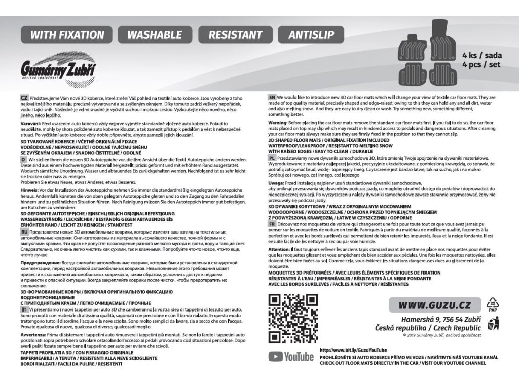 Výrobce: Krátce Vám představíme technologii tohoto prémiového produktu. Na začátku projektu jsme analyzovali stovky materiálů a textilních koberců, abychom nalezli ten pravý a jediný pro naše 3D auto koberce. A podařilo se. Jedná se o originální PA VW 450g/m3 materiál v barvě Titanově-černá. Tato textílie je na povrchu a je tím první a co zákazníka bude zajímat. Dali jsme si proto na tomto výběru záležet. Kromě toho jsou tu ale ještě další vrstvy auto koberce, které umožňují jeho tváření a odolnost, tak aby dostál svým prémiovým vlastnostem. Jsme přesvědčení, že z tohoto produktu budete nadšen(a).