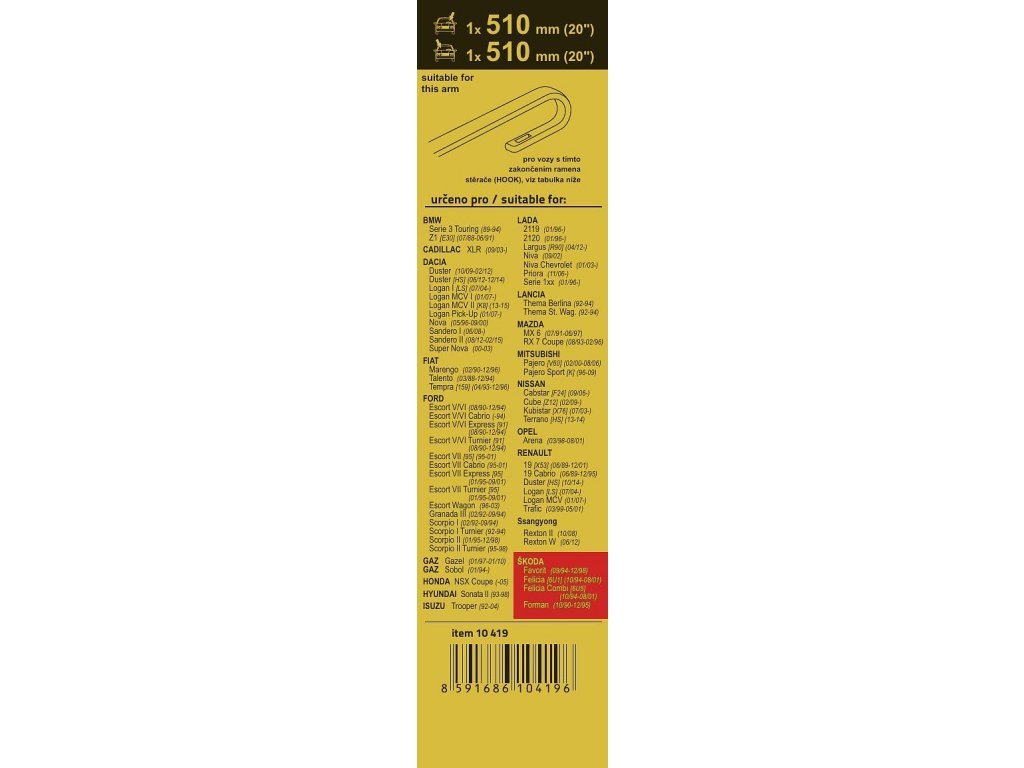 Sada dvou plochých stěračů FLAT (řidič + spolujezdec) se speciálním uchycením. Délky stěračů a systém uchycení na ramínko jsou přizpůsobeny vybraným vozům (viz tabulka použití).