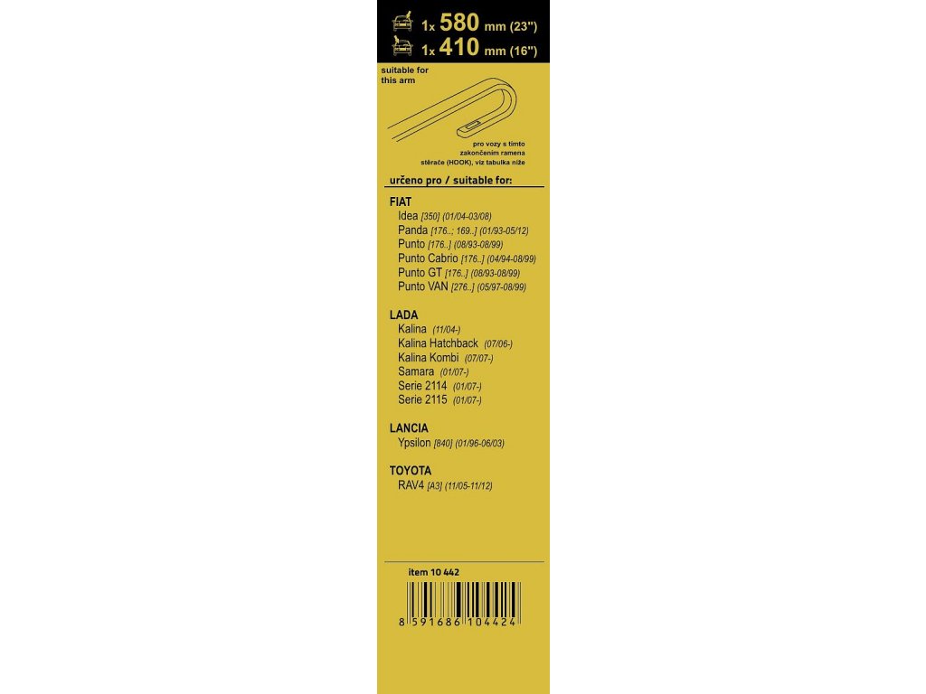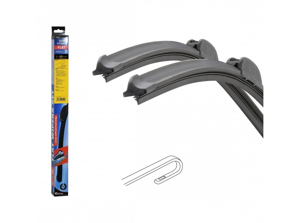 Sada dvou plochých stěračů FLAT (řidič + spolujezdec) se speciálním uchycením. Délky stěračů a systém uchycení na ramínko jsou přizpůsobeny vybraným vozům (viz tabulka použití).