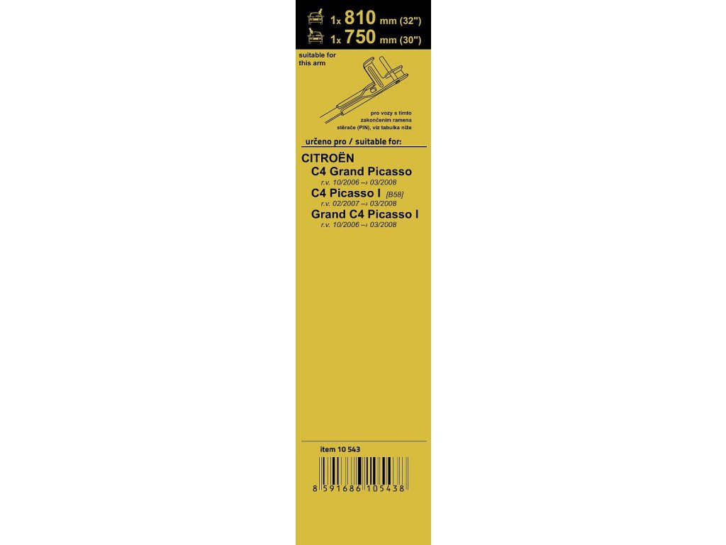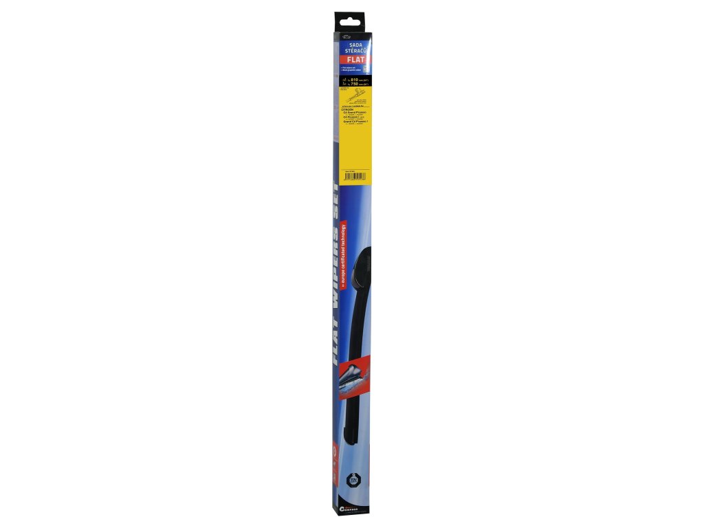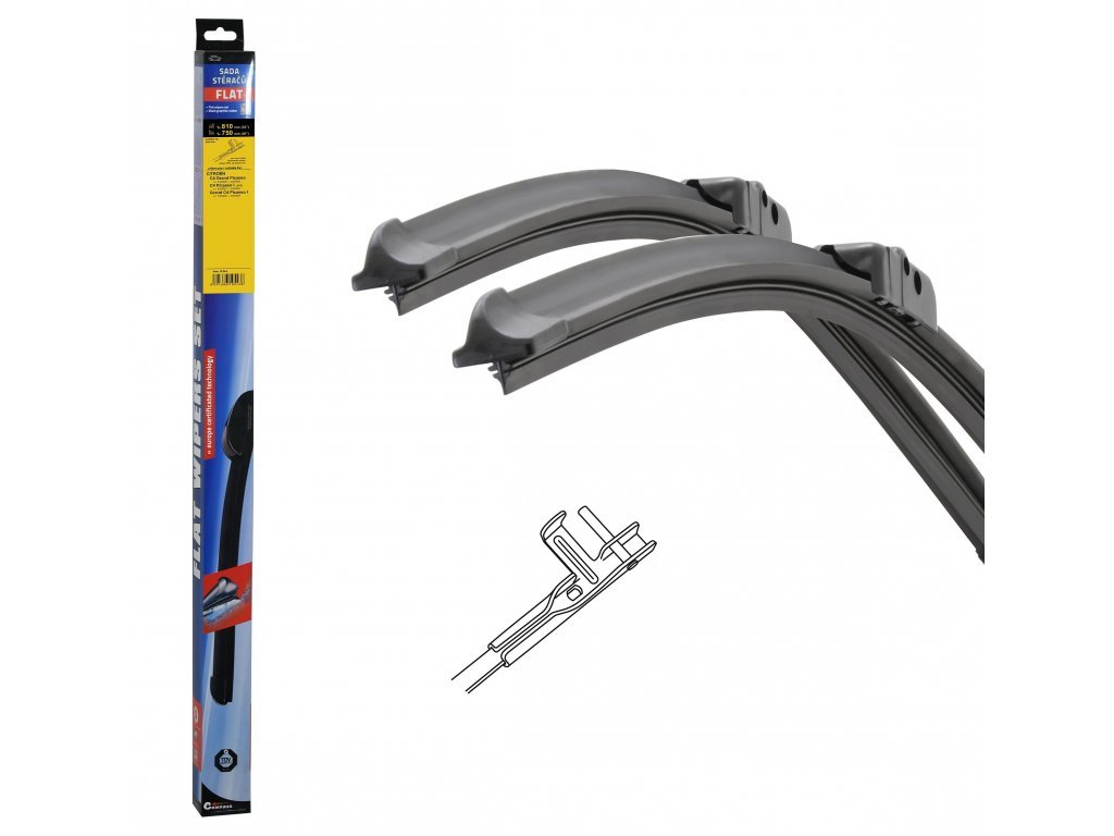 Sada dvou plochých stěračů FLAT (řidič + spolujezdec) se speciálním uchycením. Délky stěračů a systém uchycení na ramínko jsou přizpůsobeny vybraným vozům (viz tabulka použití).