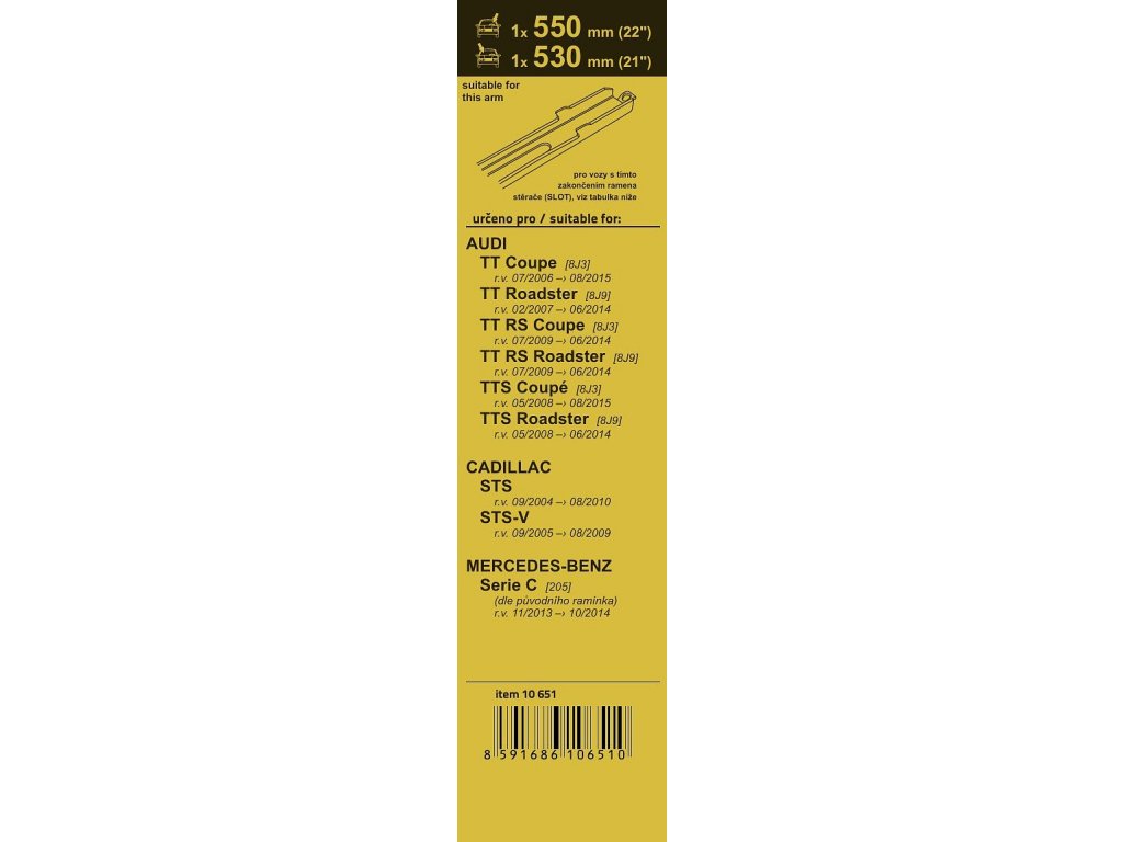 Sada dvou plochých stěračů FLAT (řidič + spolujezdec) se speciálním uchycením. Délky stěračů a systém uchycení na ramínko jsou přizpůsobeny vybraným vozům (viz tabulka použití).