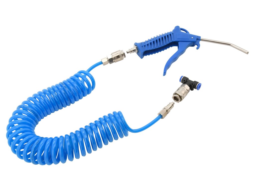Vzduchová pistole v sadě s kroucenou hadicí a T adaptérem.