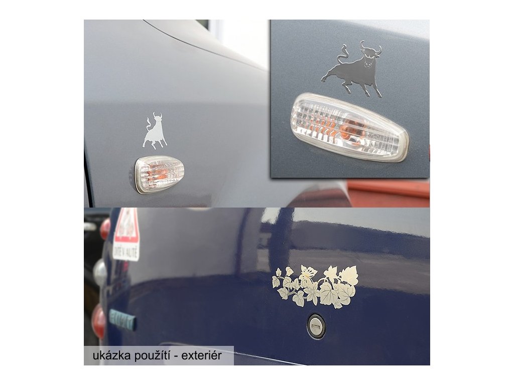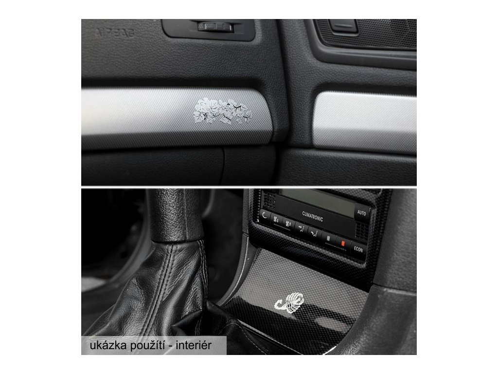 Samolepící kovová dekorace s lesklou povrchovou úpravou v kombinaci s jemným gravírováním. Elegantní doplněk automobilu - snadné nalepení. Vhodné i jako doplněk interiéru vozu.